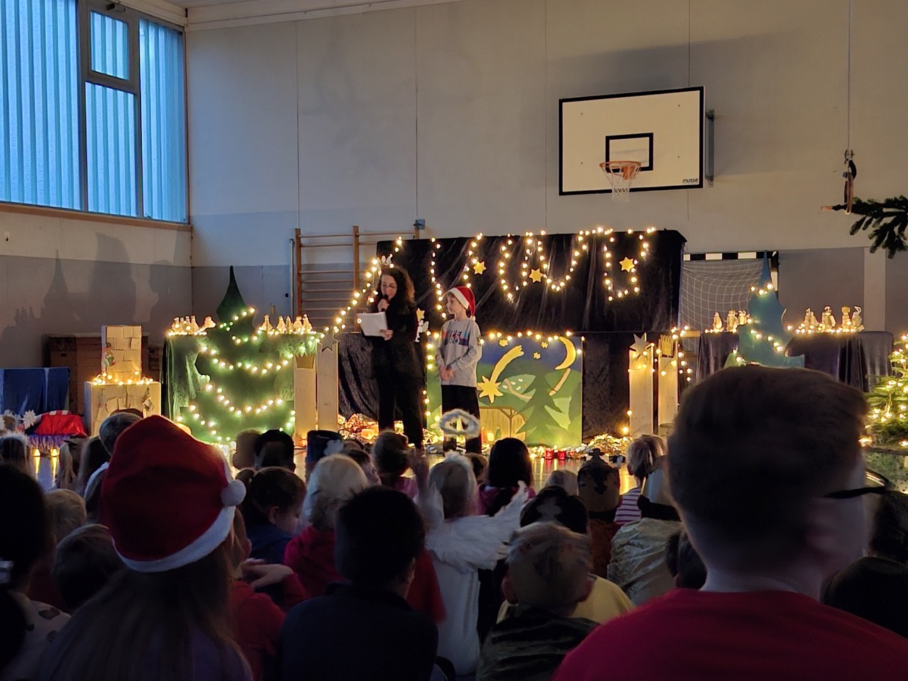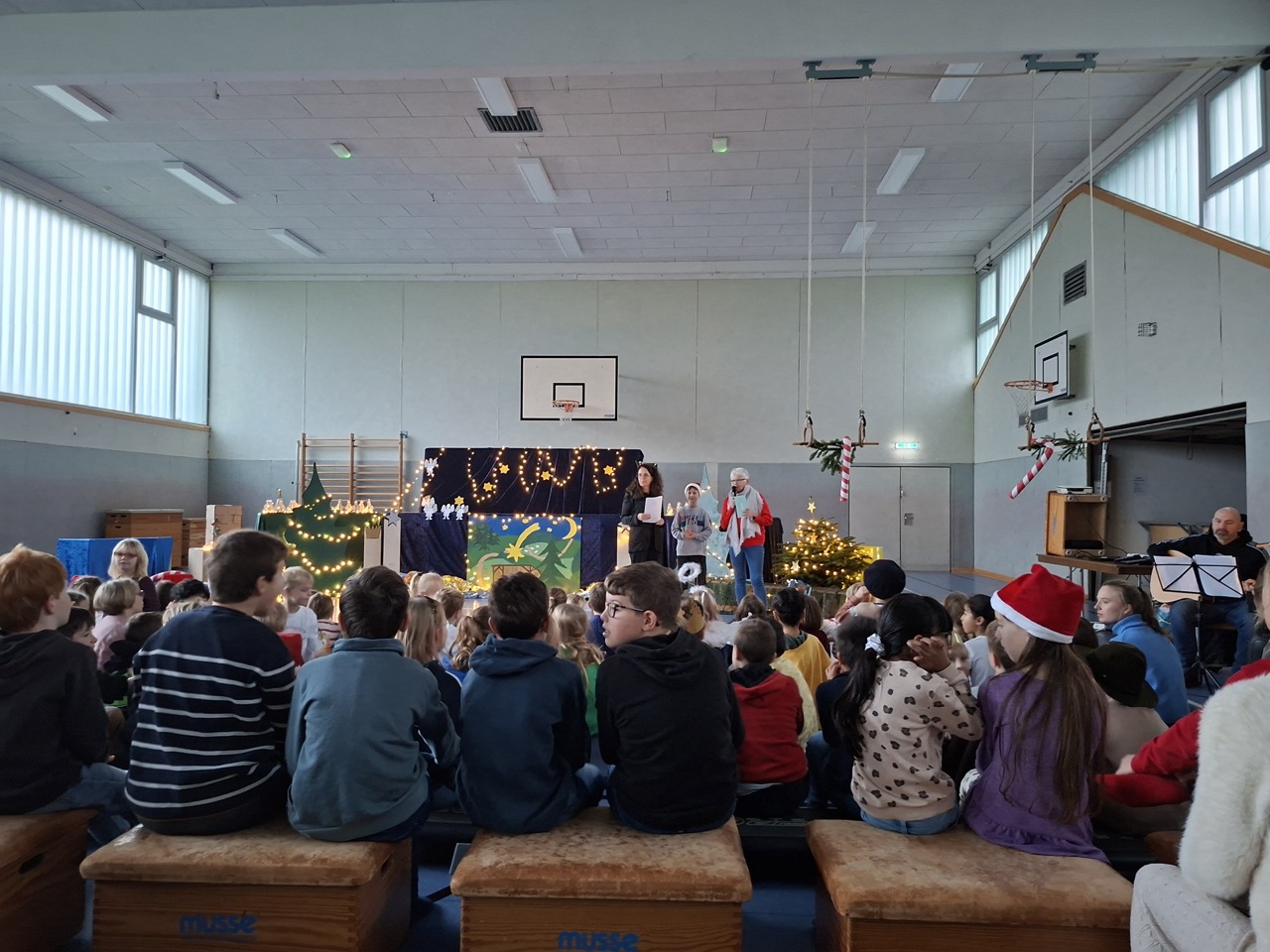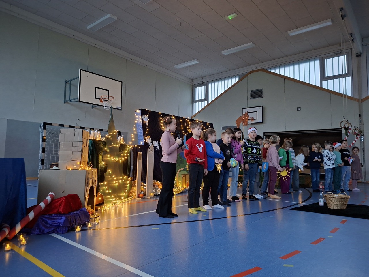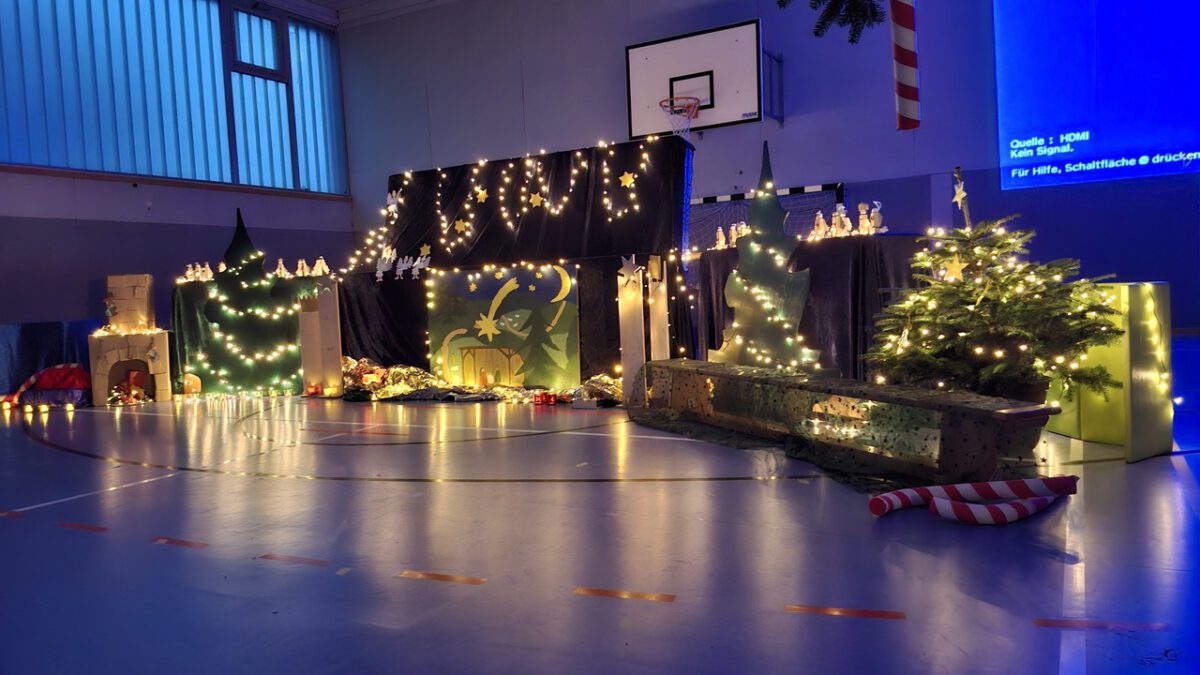 Die diesjährige Weihnachtsfeier, mit zahlreichen geladen Gästen, stimmte alle Anwesenden auf das bevorstehende Weihnachtsfest ein. In der stimmungsvoll dekorierten Turnhalle wurden neben den gemeinsam gesungenen Liedern auch mehrere Programmpunkte, in diesem Jahr von den B-Klassen, dargeboten. Ein Co-Moderator aus der Klasse 3b unterstützte bei der Ansage der verschiedenen Highlights. So gab die Klasse 1B einen „Schneeflockentanz“ zum Besten, die Klasse 2B war mit einem Spielstück „Stille Nacht, eilige Nacht“ vertreten. Das Gedicht „Die Kinder beschenken das Christkind“ wurde von der Klasse 3B vorgetragen. Im Anschluss präsentierte die Klasse 4B das Lied „Morgen kommt der Weihnachtsmann“ mit instrumentaler Begleitung.