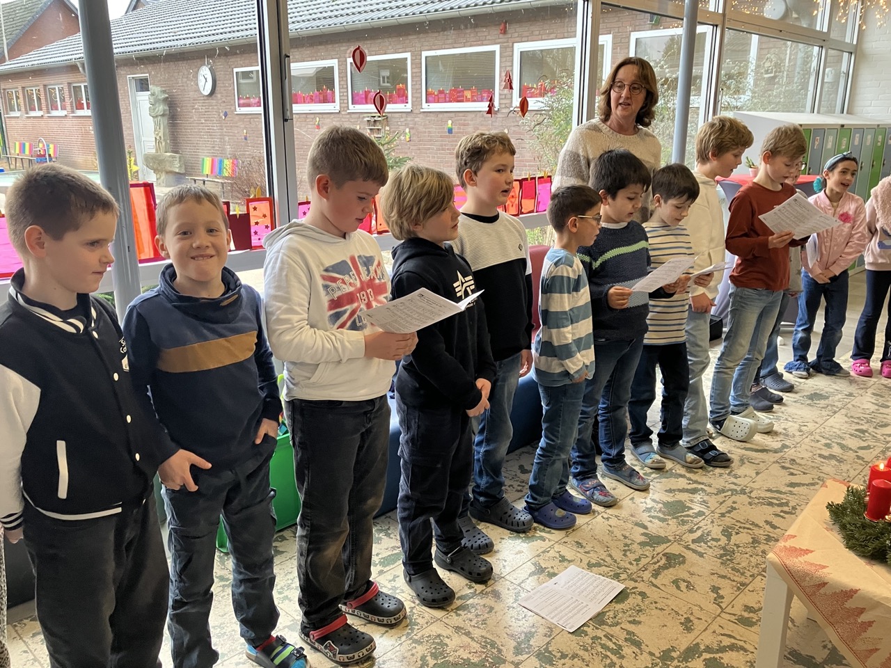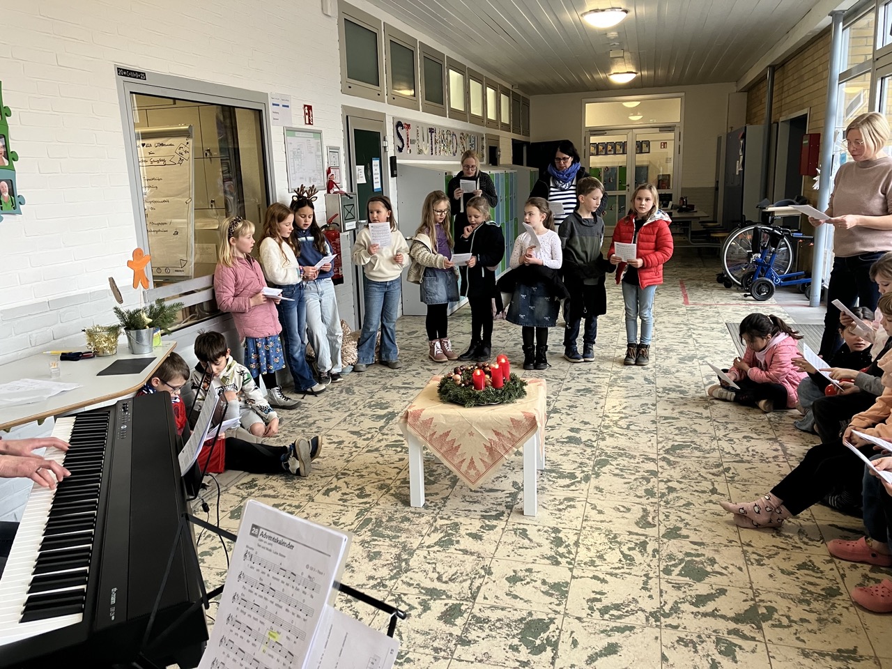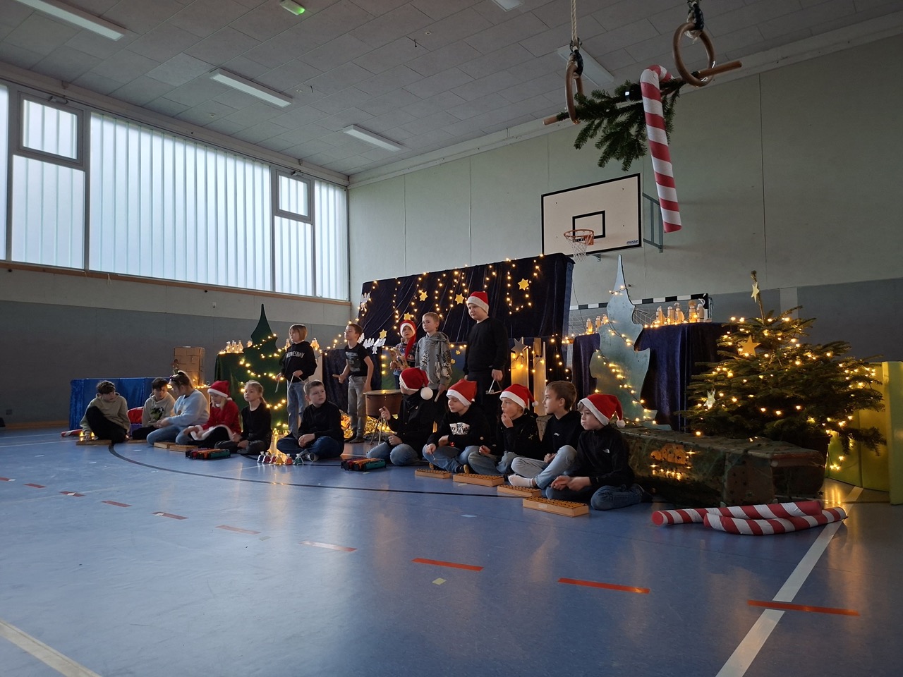 Die diesjährige Weihnachtsfeier, mit zahlreichen geladen Gästen, stimmte alle Anwesenden auf das bevorstehende Weihnachtsfest ein. In der stimmungsvoll dekorierten Turnhalle wurden neben den gemeinsam gesungenen Liedern auch mehrere Programmpunkte, in diesem Jahr von den B-Klassen, dargeboten. Ein Co-Moderator aus der Klasse 3b unterstützte bei der Ansage der verschiedenen Highlights. So gab die Klasse 1B einen „Schneeflockentanz“ zum Besten, die Klasse 2B war mit einem Spielstück „Stille Nacht, eilige Nacht“ vertreten. Das Gedicht „Die Kinder beschenken das Christkind“ wurde von der Klasse 3B vorgetragen. Im Anschluss präsentierte die Klasse 4B das Lied „Morgen kommt der Weihnachtsmann“ mit instrumentaler Begleitung.