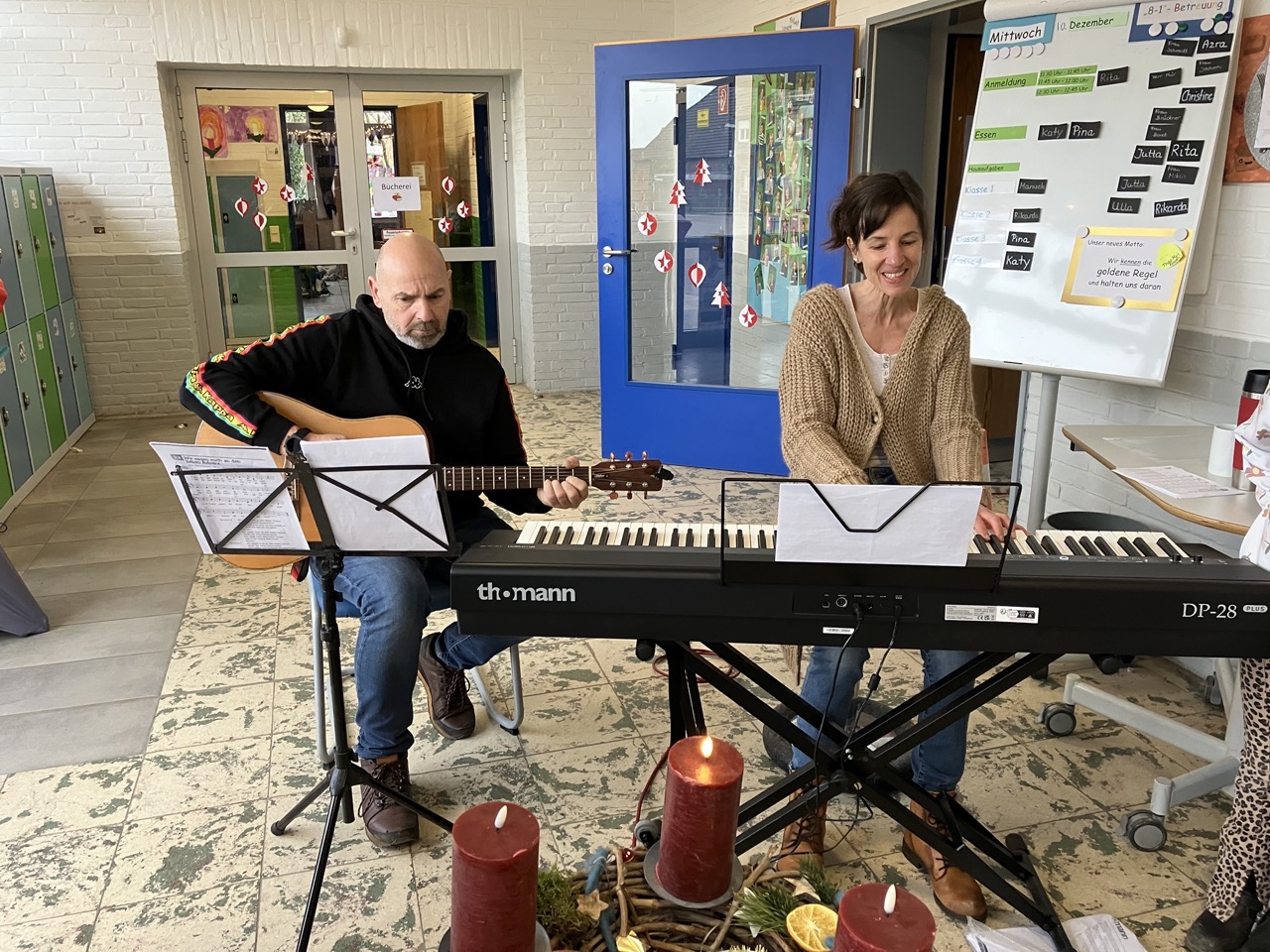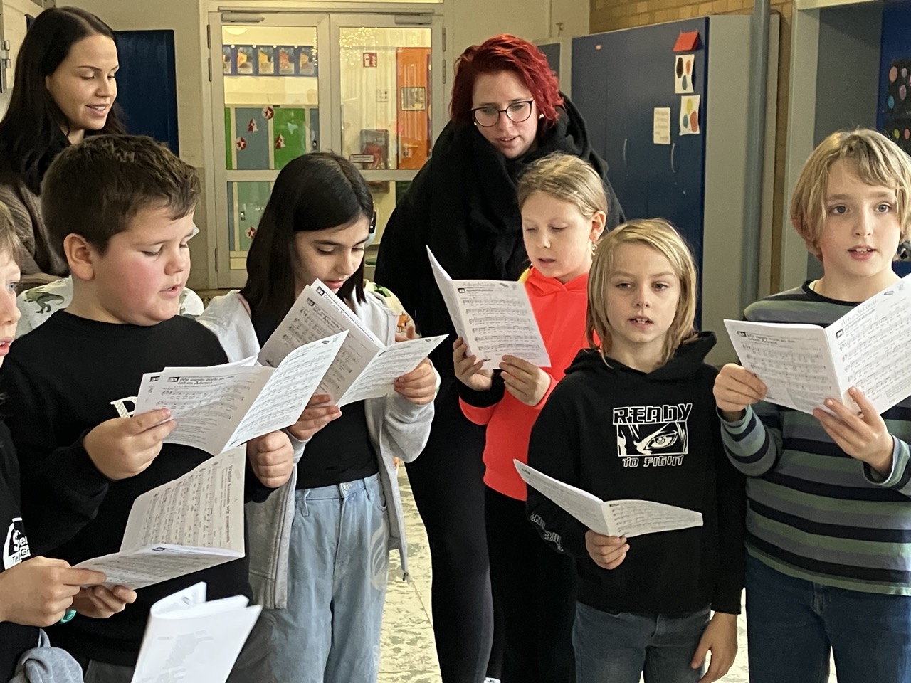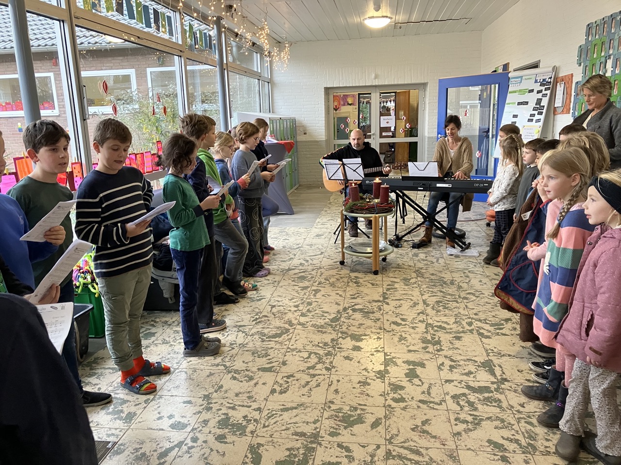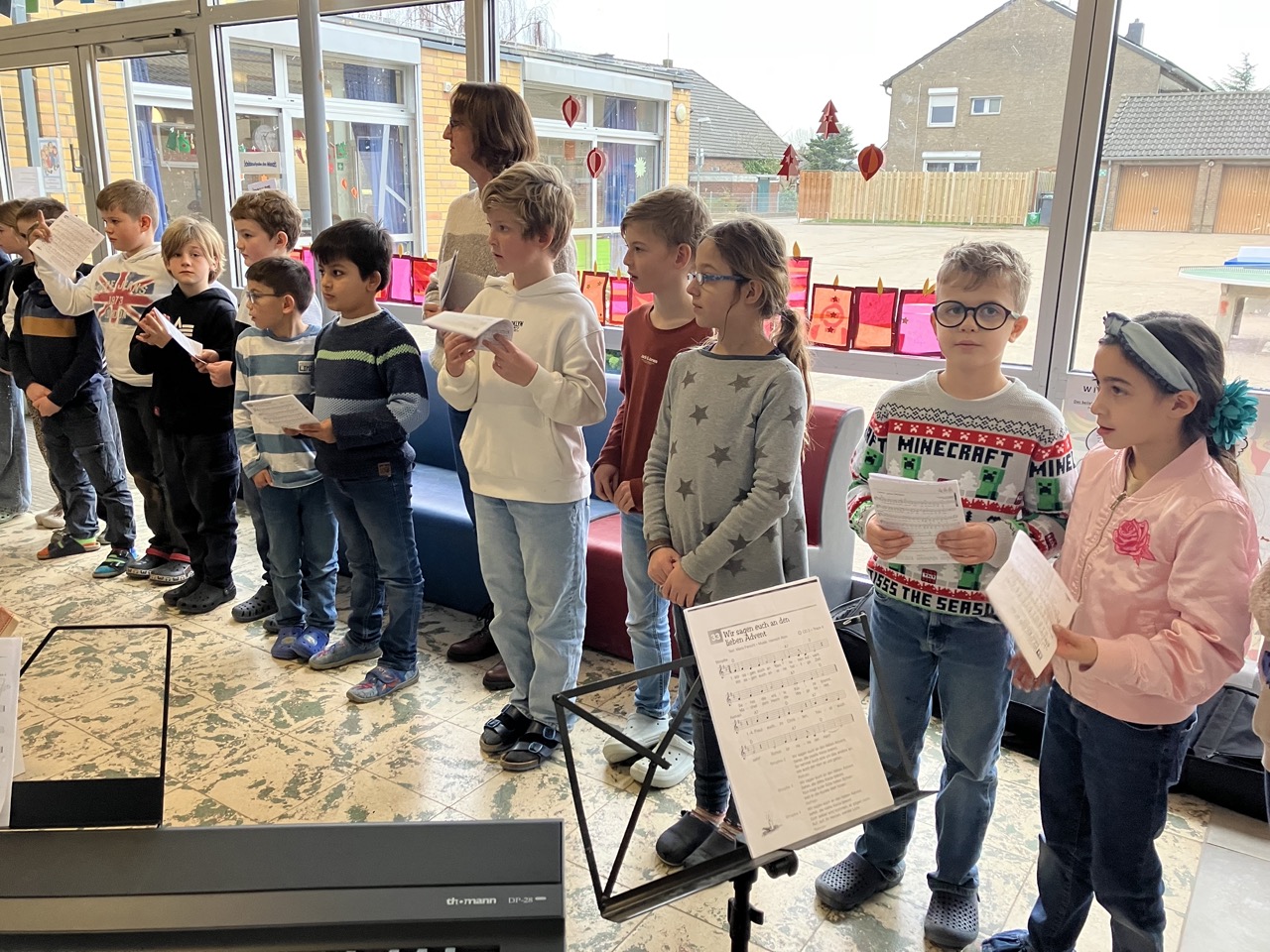Die diesjährige Weihnachtsfeier, mit zahlreichen geladen Gästen, stimmte alle Anwesenden auf das bevorstehende Weihnachtsfest ein. In der stimmungsvoll dekorierten Turnhalle wurden neben den gemeinsam gesungenen Liedern auch mehrere Programmpunkte, in diesem Jahr von den B-Klassen, dargeboten. Ein Co-Moderator aus der Klasse 3b unterstützte bei der Ansage der verschiedenen Highlights. So gab die Klasse 1B einen „Schneeflockentanz“ zum Besten, die Klasse 2B war mit einem Spielstück „Stille Nacht, eilige Nacht“ vertreten. Das Gedicht „Die Kinder beschenken das Christkind“ wurde von der Klasse 3B vorgetragen. Im Anschluss präsentierte die Klasse 4B das Lied „Morgen kommt der Weihnachtsmann“ mit instrumentaler Begleitung.