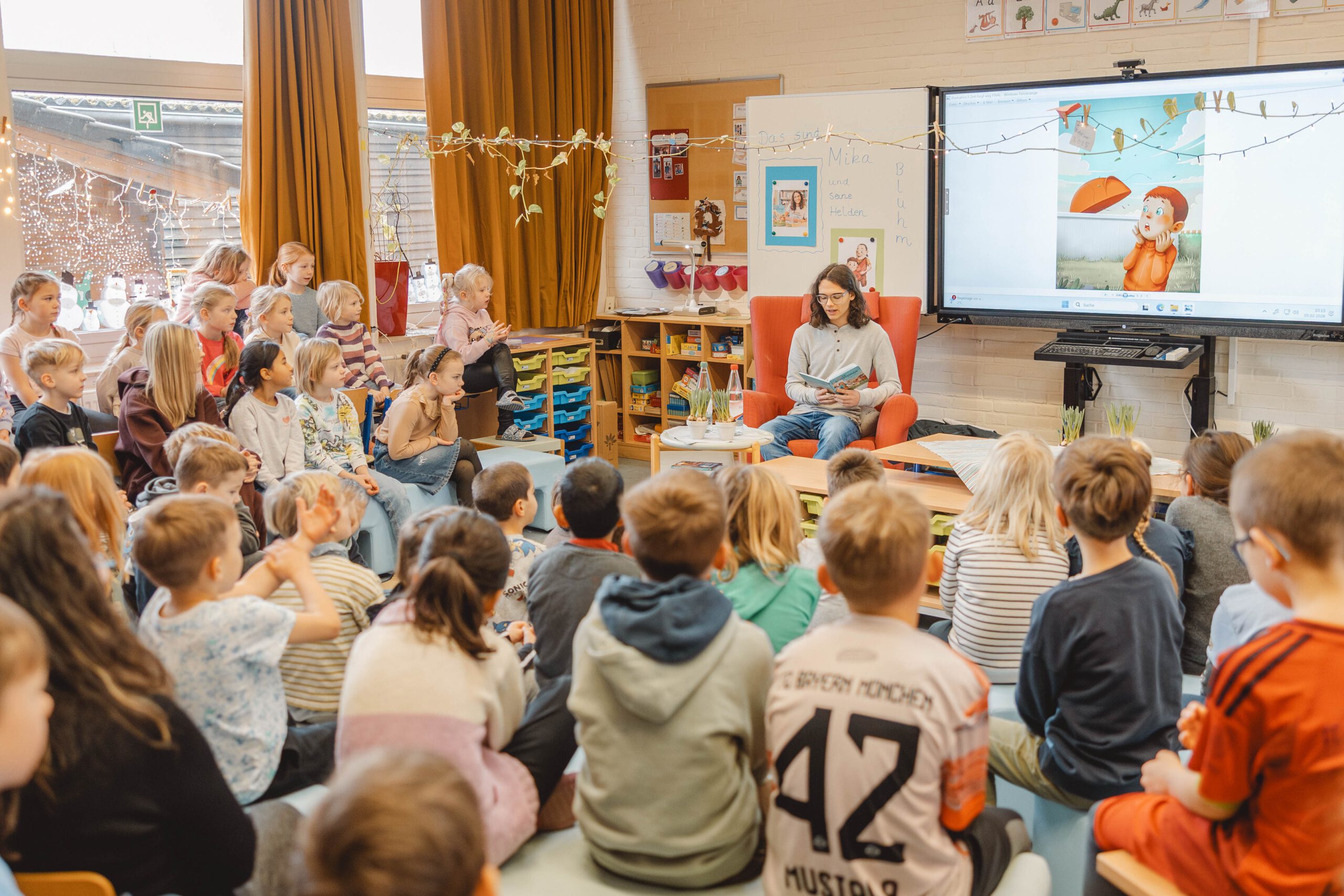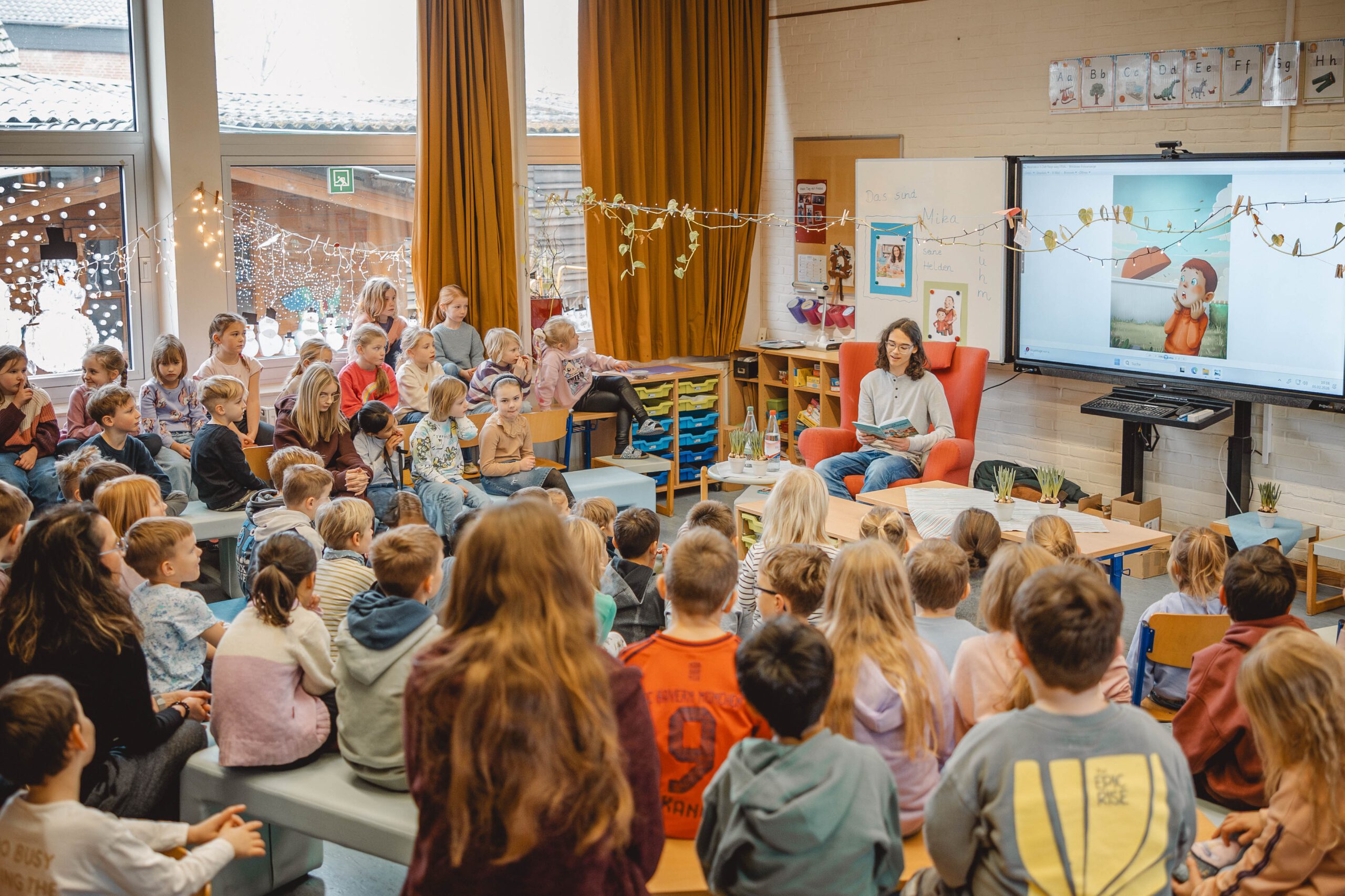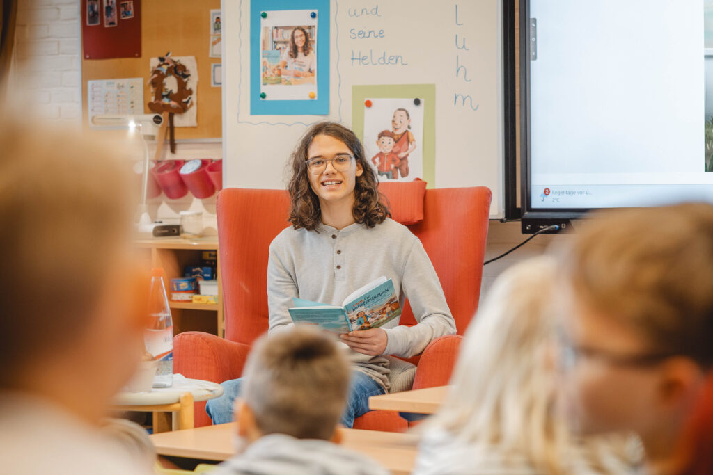 Die Lesung fand in zwei Teilen statt. Zunächst las Mika Bluhm für die Jahrgänge 1 und 2, wobei er die Kinder mit lustigen Textstellen, lebendiger Stimme und viel Charme sofort in seinen Bann zog. Im Anschluss folgte eine zweite Lesung für die Jahrgänge 3 und 4, bei der er zusätzlich Einblicke in das Schreiben eigener Geschichten gab und erzählte, wie seine Ideen entstehen.