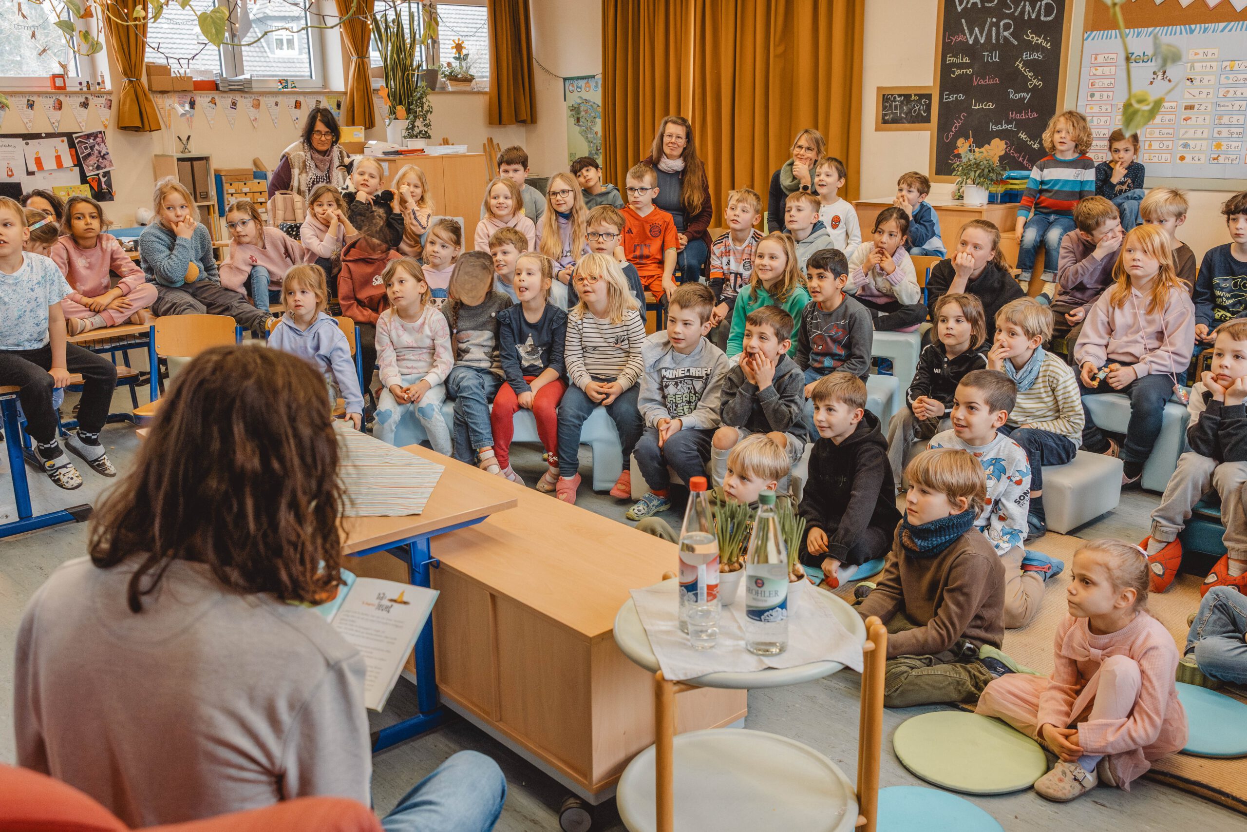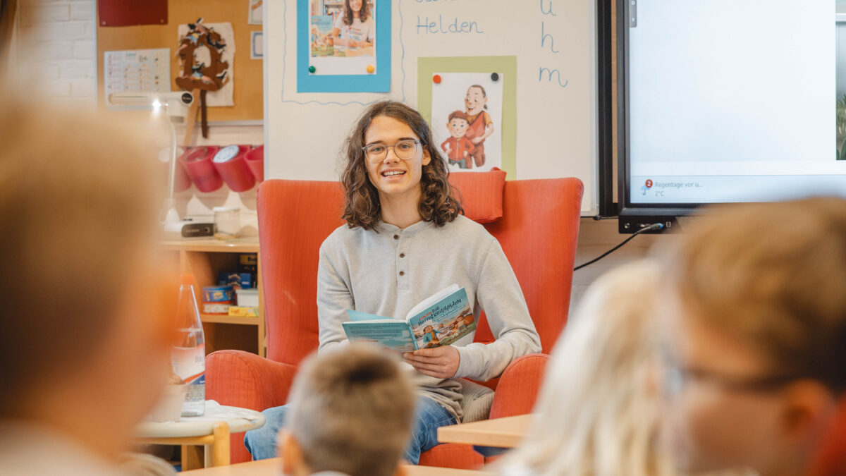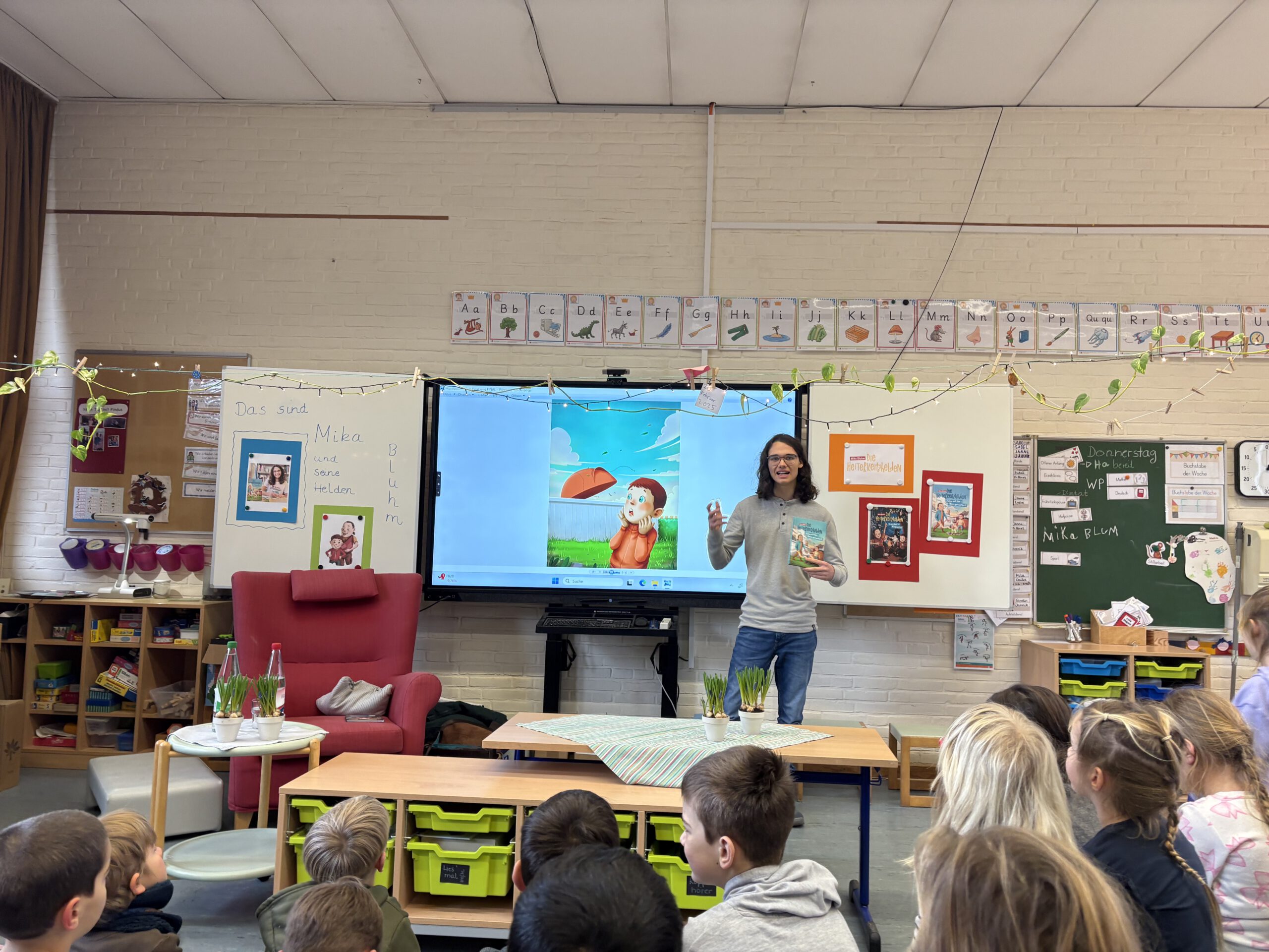 Die Lesung fand in zwei Teilen statt. Zunächst las Mika Bluhm für die Jahrgänge 1 und 2, wobei er die Kinder mit lustigen Textstellen, lebendiger Stimme und viel Charme sofort in seinen Bann zog. Im Anschluss folgte eine zweite Lesung für die Jahrgänge 3 und 4, bei der er zusätzlich Einblicke in das Schreiben eigener Geschichten gab und erzählte, wie seine Ideen entstehen.