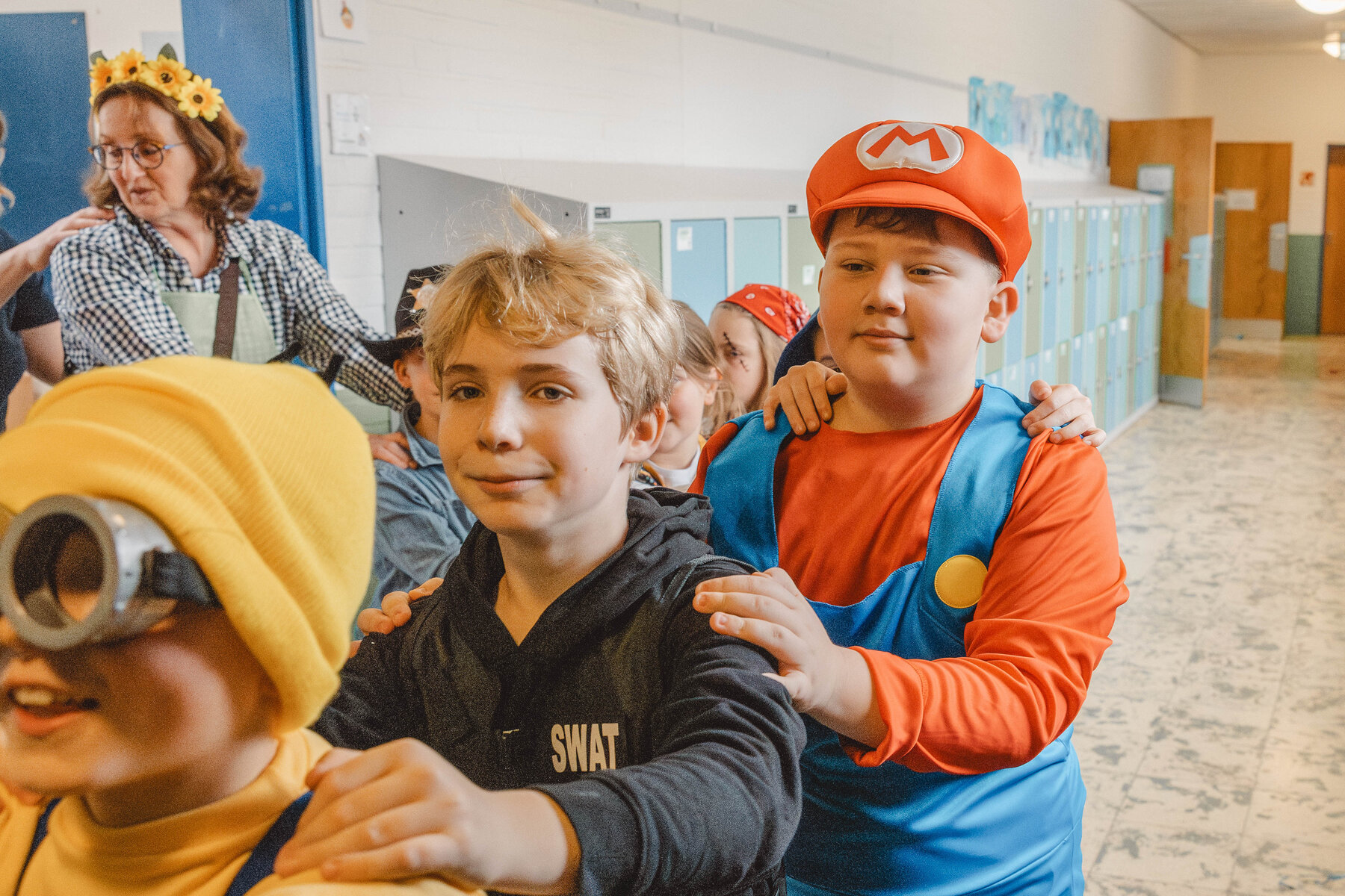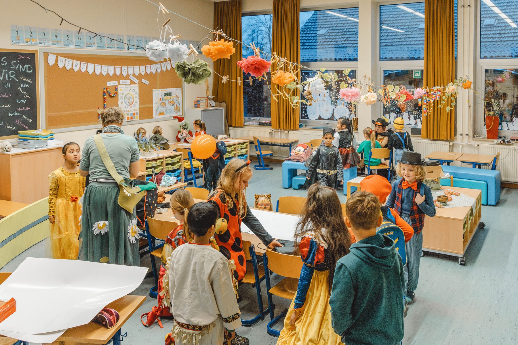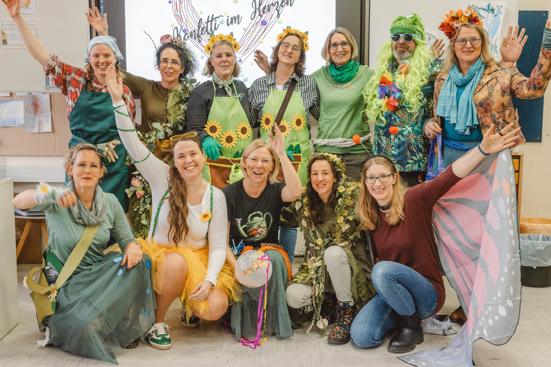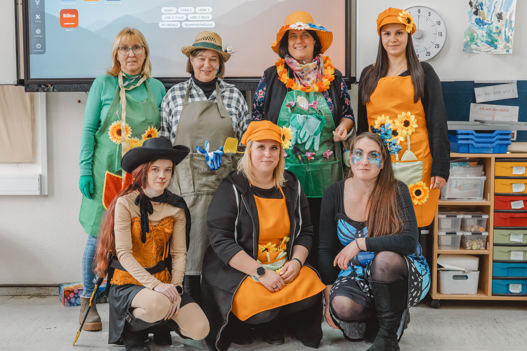 Schon am Morgen füllten wilde und bunte Kostüme die Flure und Klassenräume. Von Superhelden über Tiere und anderen lustigen Figuren war alles vertreten. Auch das Kollegium sorgte für ein besonderes Highlight: Die Lehrerinnen und Lehrer und alle Mitarbeiter*innen traten einheitlich verkleidet unter dem Motto „Wachstum“ auf – eine kreative Idee, die über die bunte Wiese, das Gänseblümchen, dem Gärtner und manch anderer kreativer Eigenkreation ging.