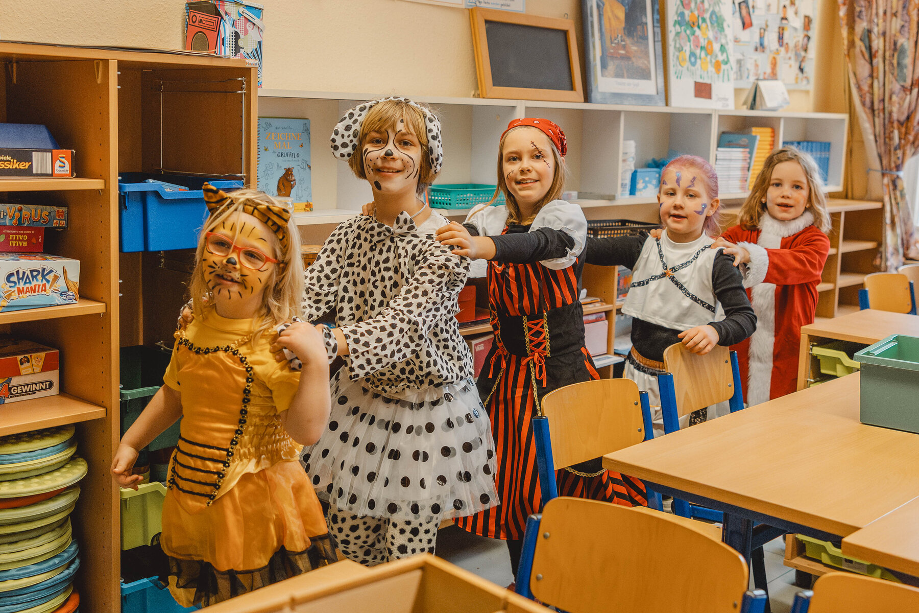 Trotz grauem Himmel und regnerischem Wetter ließen sich die Kinder unserer Grundschule die gute Laune nicht verderben: Beim diesjährigen Karnevalsfest wurde ausgelassen gefeiert, gelacht und getanzt.